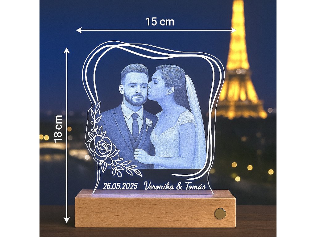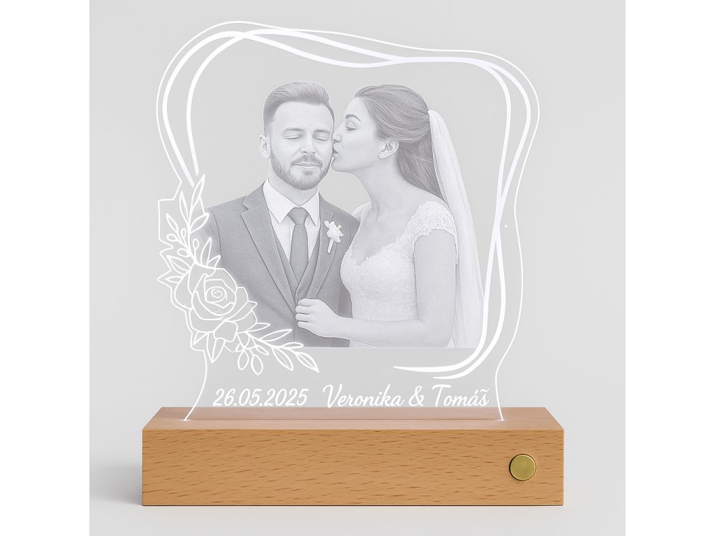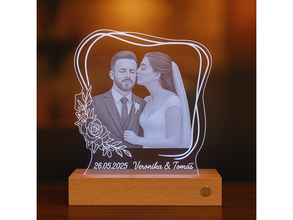 Predstavujeme vám personalizovaný gravírovaný akrylový fotorámik s motívom nádherného svadobného momentu Veroniky a Tomáša – dotyk lásky zachytený navždy. Elegantný dizajn rámika s jemným kvetinovým okrajom a ručne vyrobenou drevenou základňou premieňa tento okamih na nadčasový klenot.