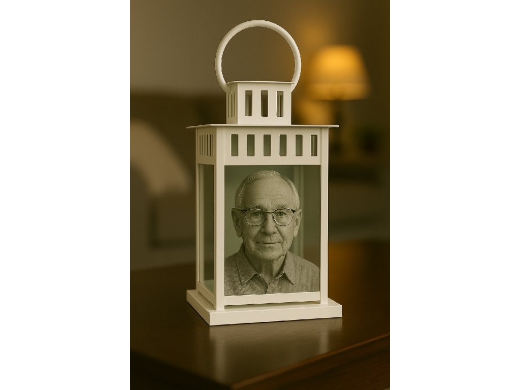 Tento kovový lampáš v elegantnej bielej farbe je výnimočný tým, že kombinuje gravírovaný portrét podľa vašej fotografie na prednom skle s možnosťou doplniť vlastný text na zadnej strane – citát, meno, dátum alebo venovanie.