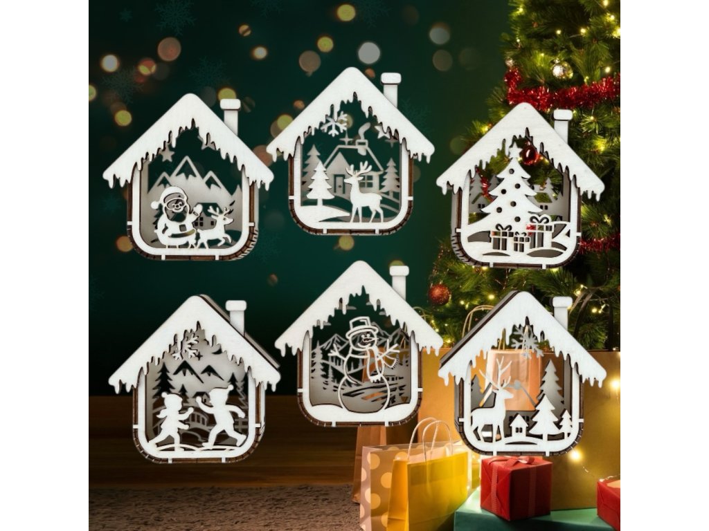 Táto posledná sada uzatvára sériu obľúbených vianočných domčekov. Každý kus je vyrobený precíznym laserovým rezaním z kvalitnej brezovej preglejky s bielym „zasneženým“ efektom. Motívy kombinujú klasické symboly Vianoc – od Santu až po snehuliaka – a vytvárajú útulné zimné scény, ktoré krásne vyniknú na stromčeku alebo v dekorácii.